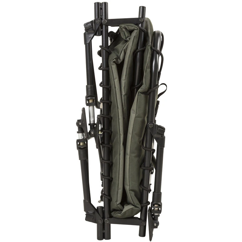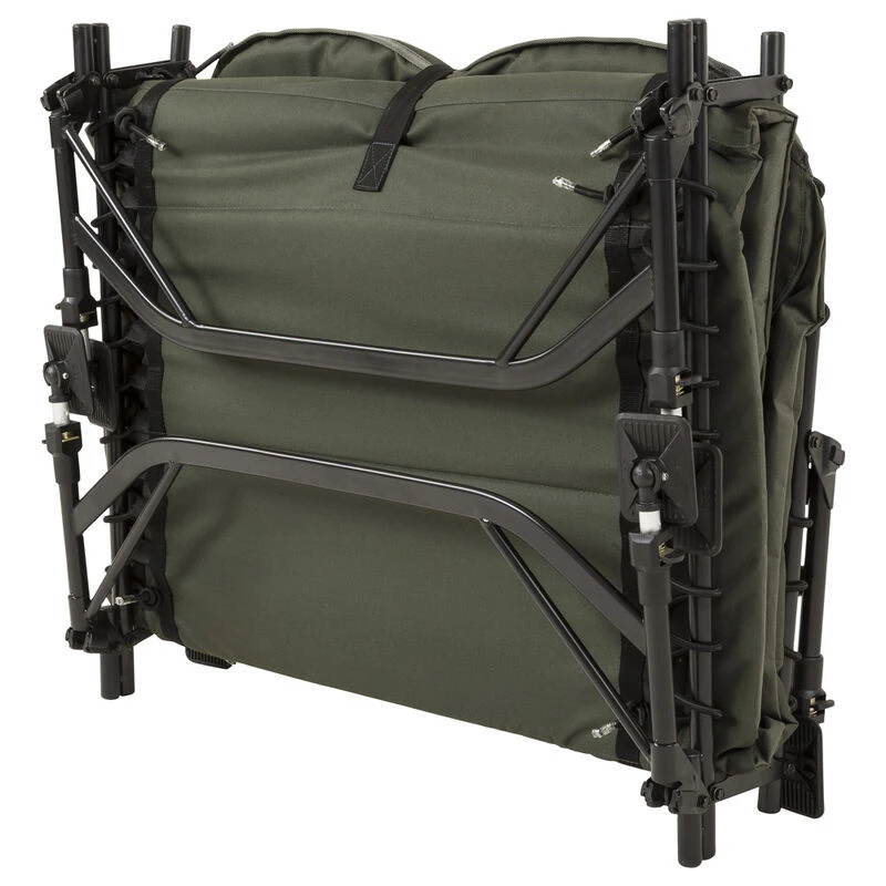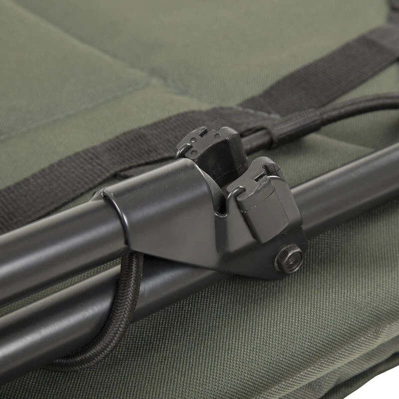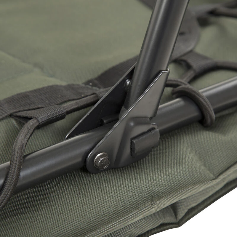 Système de double charnière pour créer l’option de lit à plat et une fois plié, créer une cavité pour qu’un sac de couchage reste attaché au bedchair pendant le transport