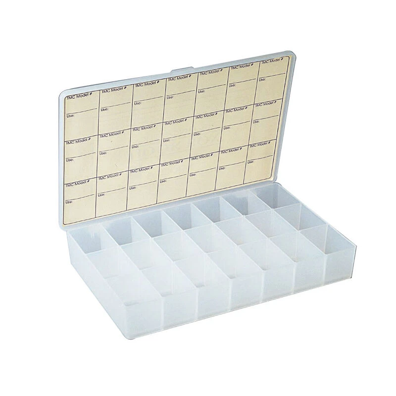 Elle comprend 21 cases, avec les angles arrondis pour pouvoir prendre facilement les hameçons.
