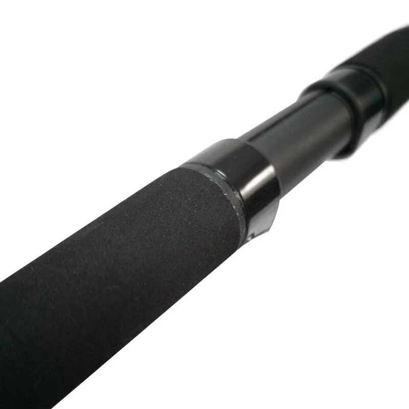 Caractéristiques de la canne : longueur 3.60m, puissance jusqu’à 70g, canne en 2 éléments, 13 anneaux, poignée en duplon, canne en carbone, blank fin et puissant, encombrement 1.55m, poids 185g.