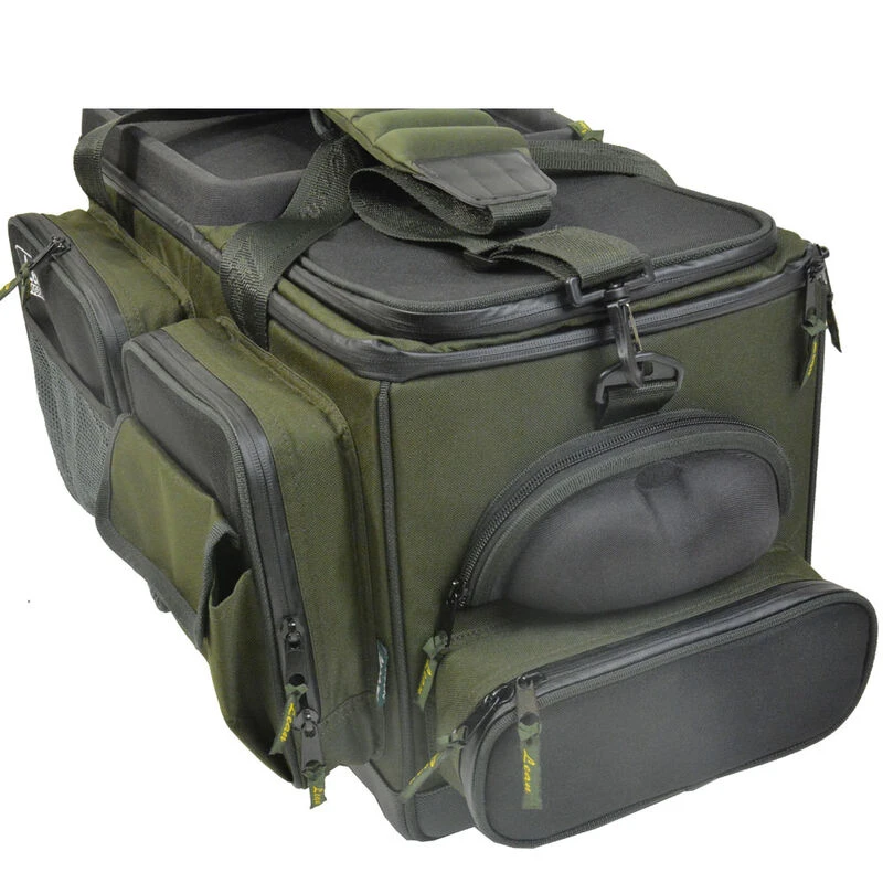 Pourvu de deux larges poches frontales, vous pourrez ainsi stocker de nombreux accessoires. L’un des côtés du sac comprend une poche de taille moyenne équipée de 4 pots afin de venir y stocker des appâts. De l’autre côté vous y retrouverez une poche afin de pouvoir stocker vos appâts ainsi qu’une autre poche dédiée au rangement des lunettes de soleil.