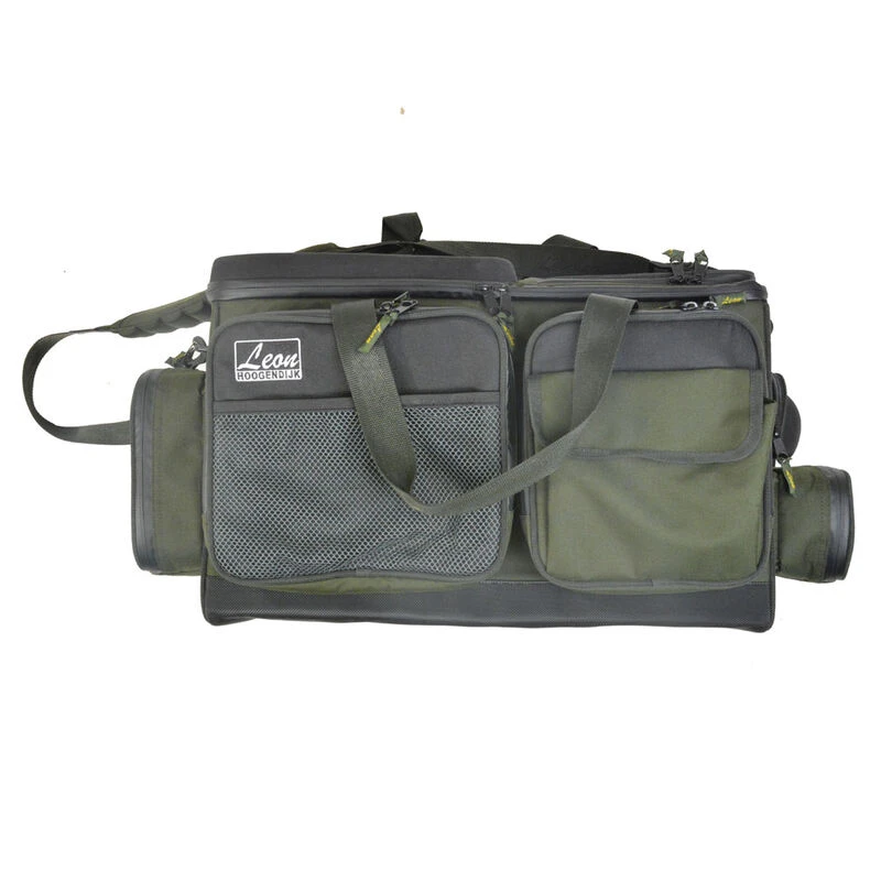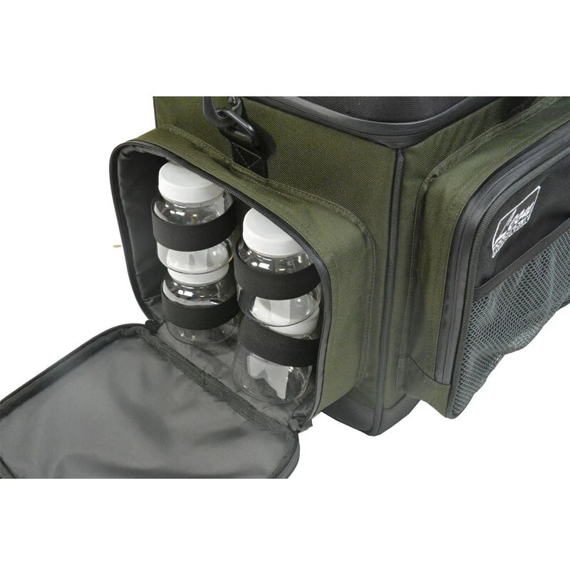 Pourvu de deux larges poches frontales, vous pourrez ainsi stocker de nombreux accessoires. L’un des côtés du sac comprend une poche de taille moyenne équipée de 4 pots afin de venir y stocker des appâts. De l’autre côté vous y retrouverez une poche afin de pouvoir stocker vos appâts ainsi qu’une autre poche dédiée au rangement des lunettes de soleil.